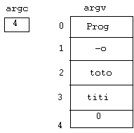 afin de récupérer dans le programme, la liste des paramètres d'exécution: argv étant un tableau de argc chaînes de caractères. Ces paramètres, ramassés sur la ligne commande, sont fournis au programme par le shell de lancement (on verra plus loin comment une primitive exec() qui réalise cela).